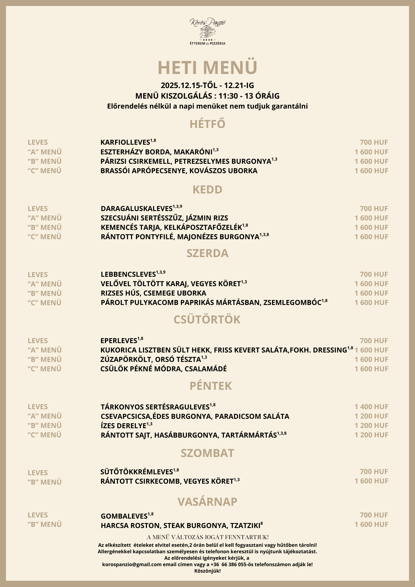 Továbbá tájékoztatjuk Önöket, hogy a menüváltozás jogát továbbra is fenntartjuk. Előrendelés nélkül a napi menüket nem tudjuk garantálni.