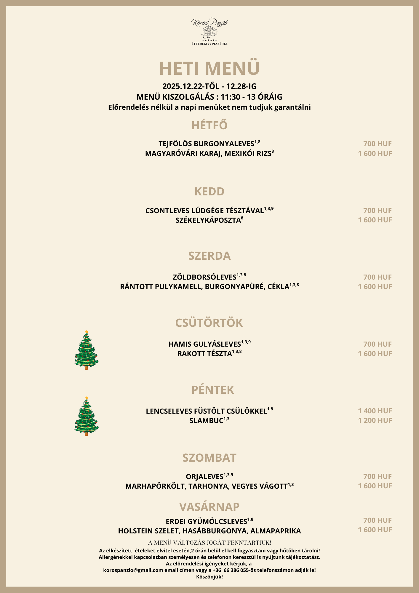 Továbbá tájékoztatjuk Önöket, hogy a menüváltozás jogát továbbra is fenntartjuk. Előrendelés nélkül a napi menüket nem tudjuk garantálni.