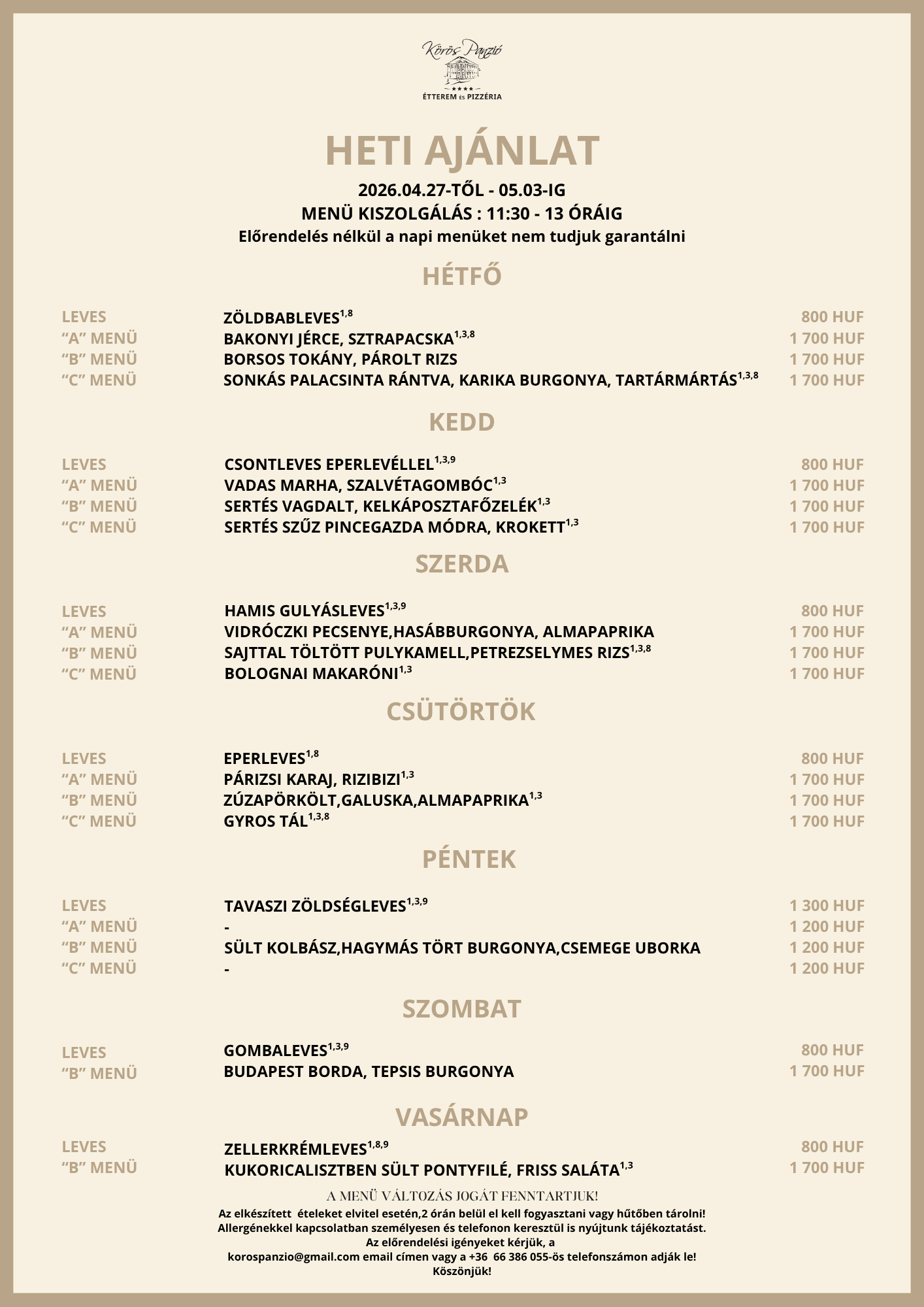 Továbbá tájékoztatjuk Önöket, hogy a menüváltozás jogát továbbra is fenntartjuk. Előrendelés nélkül a napi menüket nem tudjuk garantálni.