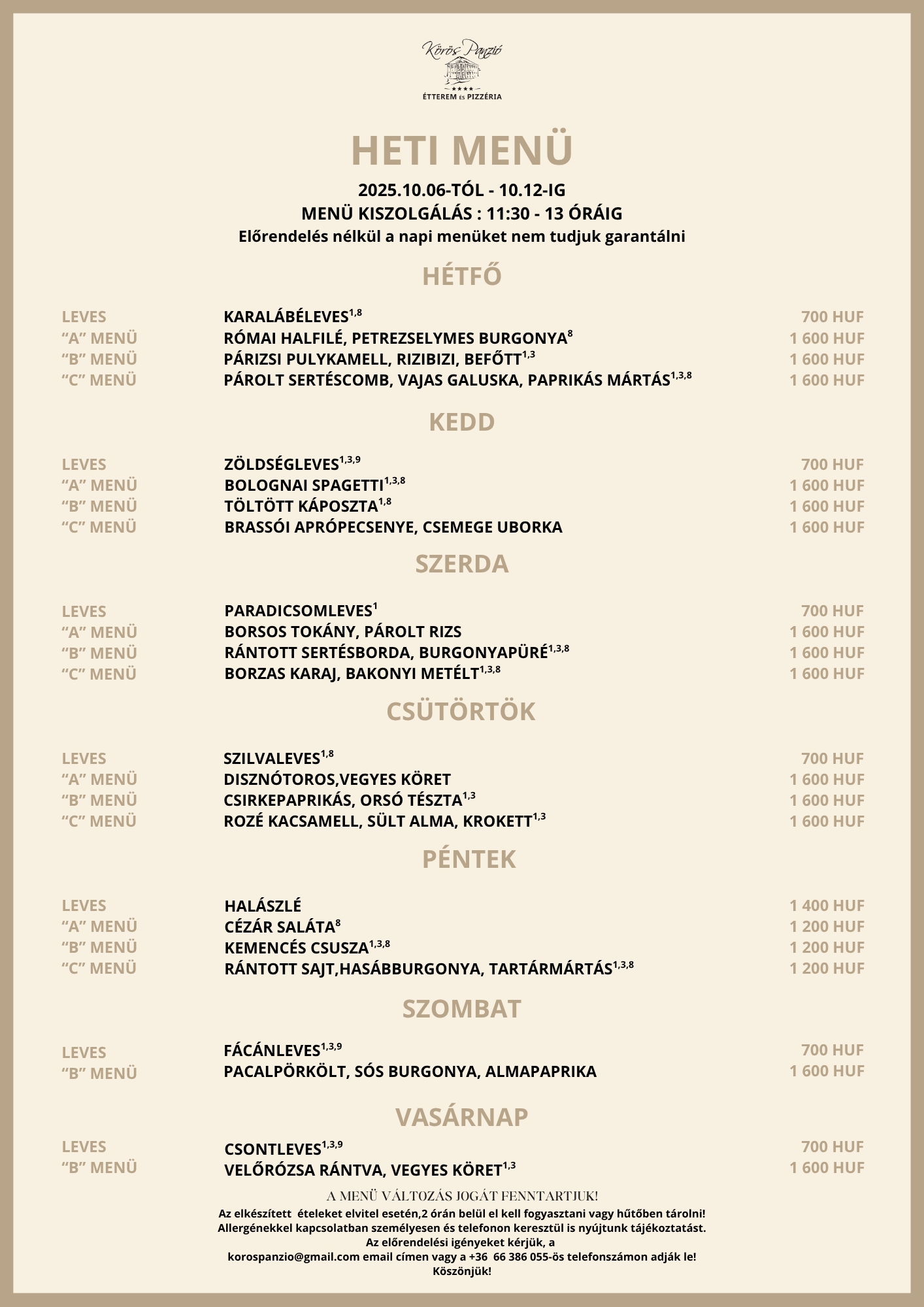 Továbbá tájékoztatjuk Önöket, hogy a menüváltozás jogát továbbra is fenntartjuk. Előrendelés nélkül a napi menüket nem tudjuk garantálni.