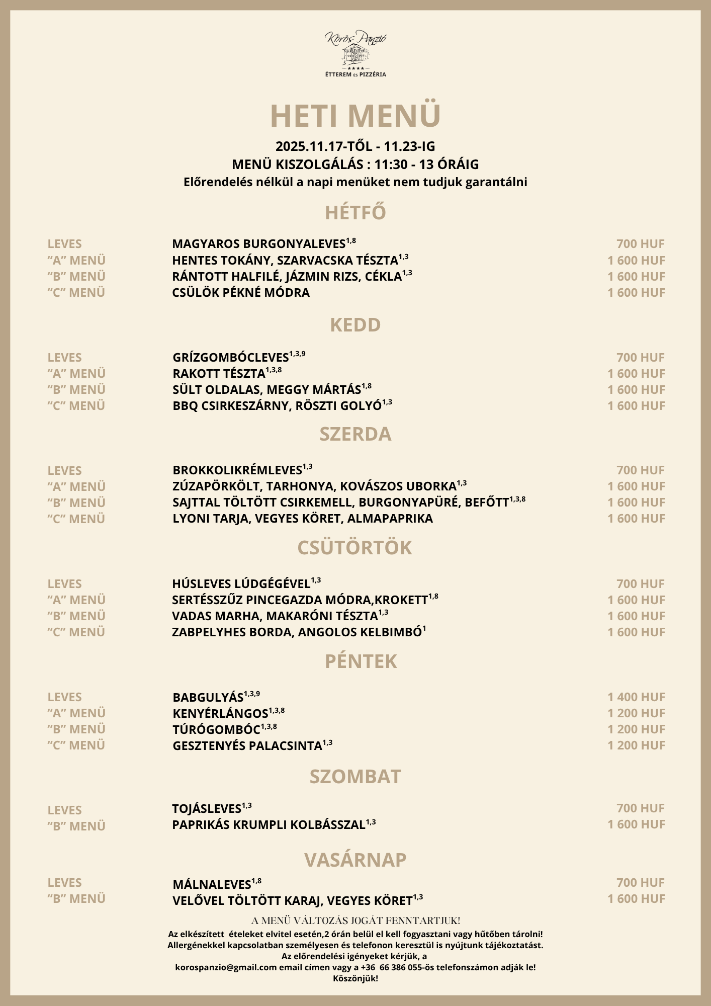 Továbbá tájékoztatjuk Önöket, hogy a menüváltozás jogát továbbra is fenntartjuk. Előrendelés nélkül a napi menüket nem tudjuk garantálni.